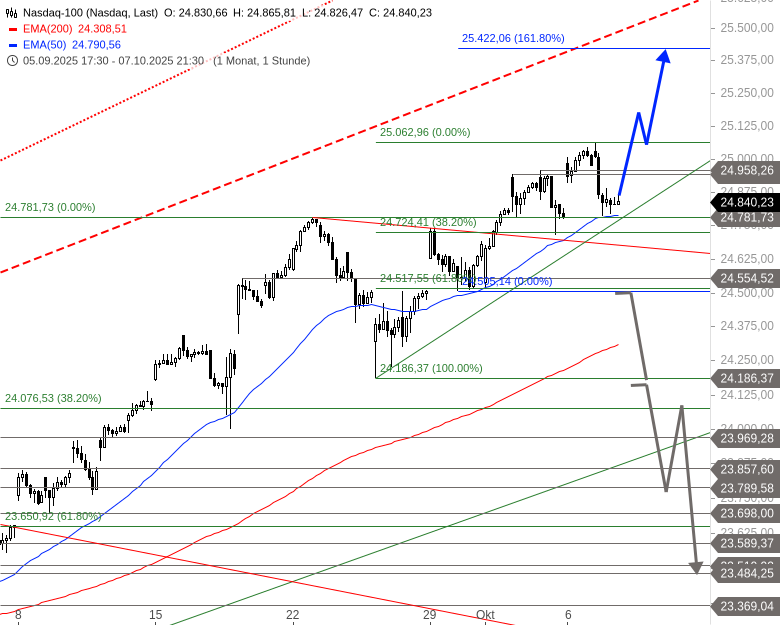 Solange der Nasdaq 100 den Unterstützungsbereich um 24.781 Punkte verteidigt, bestehen gute Chancen auf eine weitere Rally in Richtung 25.422 Punkte. Die laufende Konsolidierung könnte dabei auch in Richtung 24.554 bis 24.517 Punkte führen, ohne das Chartbild nennenswert zu beschädigen. Ein Rückfall unter 24.517 Punkte würde allerdings einen Test der Unterstützung bei 24.186 Punkten einleiten und ein stabiler Bruch dieser Marke könnte eine Bewegung bis 22.222 Punkte auslösen.