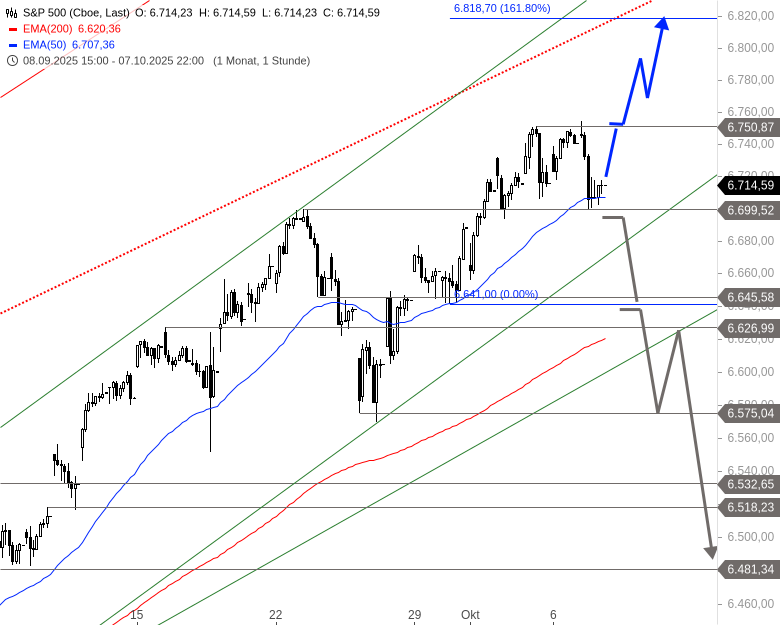 Solange der S&P 500 über der Marke von 6.699 Punkten notiert, besteht weiterhin die Chance auf eine Fortsetzung der Rally. Diese könnte den Index in Richtung 6.818 Punkte führen. Ein Stundenschlusskurs unter 6.699 USD würde jedoch einen Rückschlag für die Bullen bedeuten und Abgaben in Richtung 6.645 bis 6.641 Punkte einleiten. Sollte diese Zone ebenfalls fallen, wären weitere Verluste in Richtung 6.575 und 6.481 Punkte wahrscheinlich.