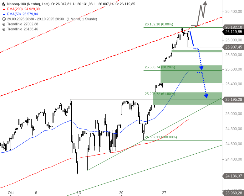 Ein stabiler Ausbruch über das gestrige Hoch würde die Rally fortsetzen und Potenzial bis etwa 27.000 Punkte eröffnen. Solange der Index jedoch unter dem Rekordhoch bleibt, steigt die Wahrscheinlichkeit einer Konsolidierung. Diese könnte zunächst bis 25.586 Punkte reichen, bei weiterer Schwäche auch in den Bereich zwischen 25.225 und 25.195 Punkten führen. Ein Stundenschlusskurs unter dem gestrigen Tagestief wäre ein mögliches Verkaufssignal.