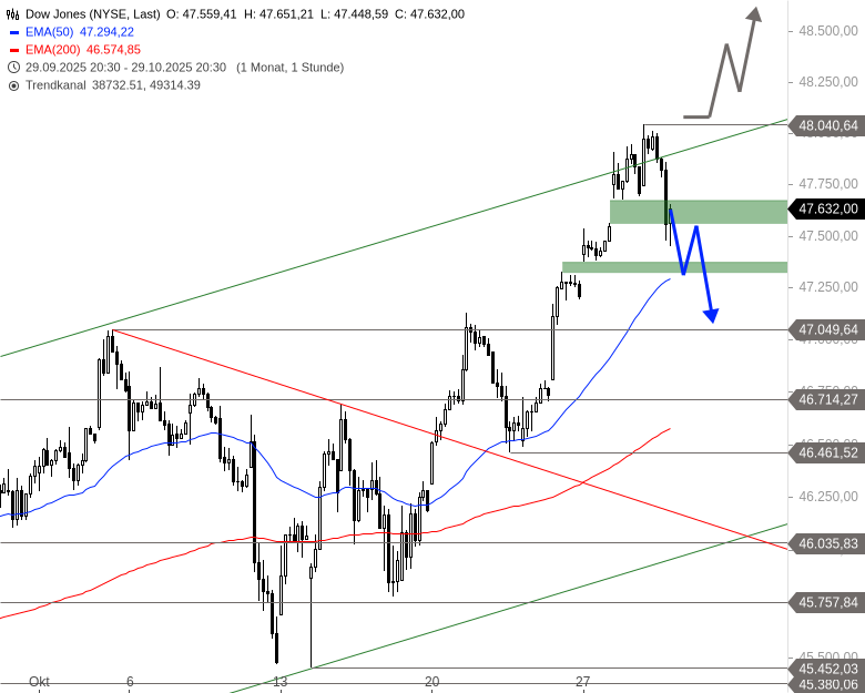 Die gestrige Kursentwicklung könnte den Beginn einer mehrtägigen Konsolidierung markieren. Ein Rücklauf auf 47.049 Punkte, dem alten Hoch vom 3. Oktober, wäre denkbar. Sollte es dem Index hingegen gelingen, das neue Rekordhoch dynamisch zu überwinden, würde sich weiteres Potenzial bis zur oberen Begrenzung der Aufwärtsbewegung seit Oktober 2022 eröffnen. Diese liegt aktuell bei rund 49.300 Punkten.