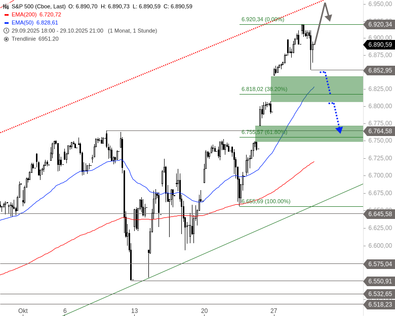 Der gestrige Abverkauf könnte als Beginn einer Konsolidierungsbewegung gewertet werden. In den kommenden Tagen wären Rücksetzer bis 6.818 Punkte denkbar, bei weiterem Verkaufsdruck auch in den Bereich zwischen 6.764 und 6.755 Punkten. Ein Unterschreiten des gestrigen Tagestiefs würde diesen Szenarien zusätzlich Gewicht verleihen. Ein bullisches Szenario eröffnet sich hingegen bei einer direkten Fortsetzung der Aufwärtsbewegung mit Ziel an der Pullbacklinie bei 6.951 Punkten.