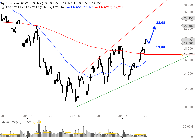 Aus technischer Sich hat der MDAX-Titel mit dem Anstieg über die Hürde bei 19,00 EUR ein Kaufsignal erzeugt. Ein klassischer Pullback auf das Ausbruchsniveau würde eine Kaufchance bieten. Solange das Tief bei 17,02 EUR nicht unterschritten wird, könnte der Wert in der zweiten Jahreshälfte die Rally bis auf 22,68 EUR fortsetzen. Desweiteren kann man sich zur Bestimmung von höheren Zielen an der eingezeichneten Pullbacklinie in rot orientieren. Der Aufwärtstrend seit dem Jahr 2015 verläuft derzeit bei rund 14,00 EUR.