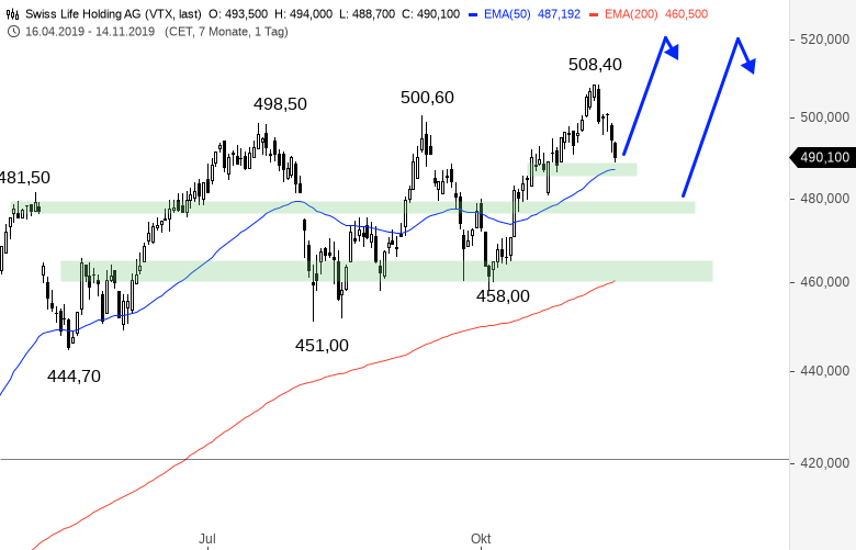 Die Aktien von Swiss Life Holding gaben im September von ihrem Hoch rund 10 Prozent ab und starteten dann von diesem Kursniveau eine neue Rally-Bewegung. Dabei entstand bei 508,40 CHF ein neues Allzeithoch. Doch nach diesem Hoch nahmen einige Marktteilnehmer ihre Gewinne wieder mit. Daher notieren die Wertpapiere aktuell bei rund 490,00 CHF. Geben die Käufer in den kommenden Tagen bereits am EMA50 wieder Gas oder fällt der Titel auf die nächste Unterstützung zurück?
