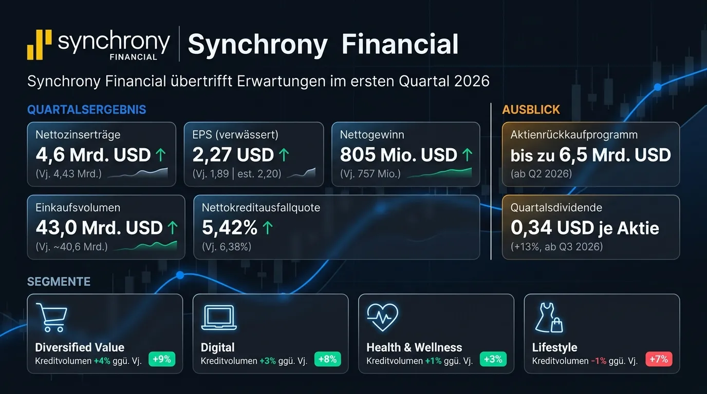 Synchrony Financial hat im ersten Quartal 2026 einen Nettogewinn von 805 Mio. USD erzielt, ein Plus von 6% gegenüber dem Vorjahreswert von 757 Mio. USD. Das verwässerte Ergebnis je Aktie stieg auf 2,27 USD von 1,89 USD im Vorjahreszeitraum und übertraf damit die Analystenerwartungen von 2,20 USD. Der Umsatz in Form von Nettozinserträgen erhöhte sich um 4% auf 4,6 Mrd. USD, während das Einkaufsvolumen um 6% auf einen Rekordwert von 43,0 Mrd. USD zulegte. Der Vorstand genehmigte ein neues Aktienrückkaufprogramm über bis zu 6,5 Mrd. USD sowie eine geplante Erhöhung der Quartalsdividende um 13% auf 0,34 USD je Aktie ab dem dritten Quartal 2026.