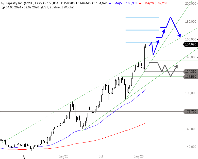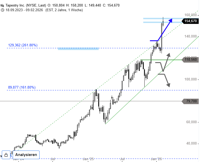 Zwischen 157 und 163 USD spannt sich ein breites Zielcluster auf, das den Höhenflug der Anteile von Tapestry kurzfristig einbremsen könnte. Eine solche Konsolidierung könnte sowohl in Gestalt einer Seitwärtsphase auf Rekordniveau, als auch in Form eines Rücksetzers unter 147 USD und einem kurzen Abtauchen an die Oberseite des überwundenden Trendkanals auf Höhe von 140 USD ablaufen.