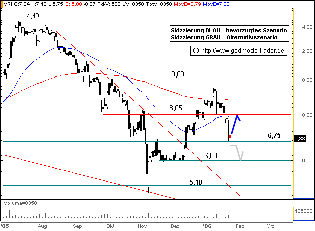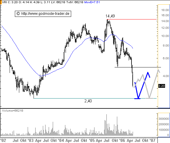 Rückblick: Die VARETIS Aktie fiel nach einem Zwischenhoch im Sommer 2005 bei 14,49 Euro kräftig zurück. Die Abwärtsbewegung beschleunigte sich in den letzten Wochen, so dass der Kurs der Aktie in einer wahren Ausverkaufswelle auf das Allzeittief bei 2,40 Euro zustürzt