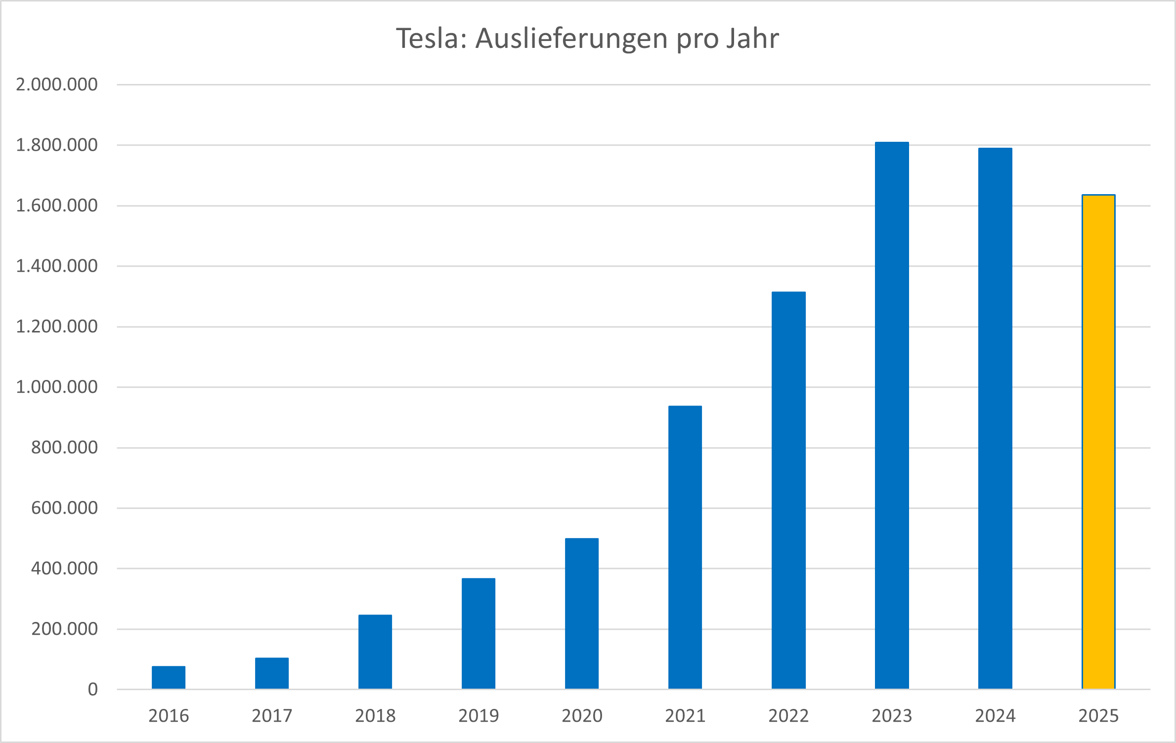 Im Gesamtjahr 2025 sanken die Auslieferungen um 8,6 % auf rund 1,64 Mio. Fahrzeuge. Damit handelt es sich um das zweite Jahr mit einem Absatzrückgang in Folge, nachdem die Auslieferungen bis zum Jahr 2023 regelmäßig in einer Größenordnung von rund 40 % pro Jahr gesteigert worden waren.