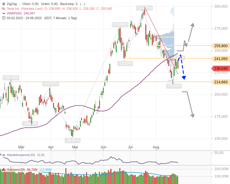 Der Spätsommer entwickelt sich für Aktionäre in der Tesla-Aktie zunehmend zum Desaster. Nachdem die Aktie Mitte Juli noch ein neues Hoch bei knapp 300 USD erreichte, kam es zu Kehrtwende und der Kurs fiel bis auf 215 USD und den dortigen Supportbereich zurück. Anfang der aktuellen Woche konnte dort eine Erholung eingeleitet werden. Der alte Supportbereich bei 241 USD stellte jedoch schnell eine bis dato zu große Herausforderung für die Bullen dar. In mehreren Versuchen prallte der Kurs nach unten ab. Zum Glück zeigte sich jedoch ab 229 USD relativ schnell neues Kaufinteresse, so auch gestern. In der Folge bewegt sich der Kurs nun mittlerweile drei Tage seitwärts und wenn wir den vorbörslichen Indikationen glauben wollen, könnte dies heute so bleiben. Die Aktie wird sehr aktiv gehandelt und liegt auf Tradegate 0,80 % im Plus.