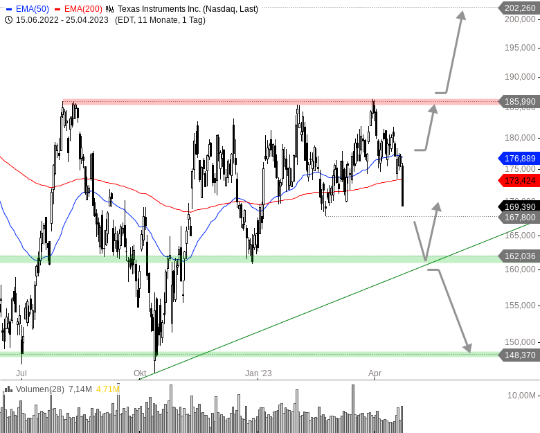 Texas Instruments konnte im ersten Quartal mit einem Gewinn je Aktie von 1,85 USD die Analystenschätzungen von 1,77 USD leicht schlagen, der Umsatz lag mit 4,38 Mrd. USD im Rahmen der Erwartungen. Diese Zahlen bedeuten einen im Vergleich zum letzten Quartal 2022 um 6 % geschrumpften Erlös (knapp 4,4 Mrd. USD). Enttäuschender ist der vorsichtige Ausblick auf das kommende Quartal, hier wird mit einem Umsatz zwischen 4,17 und 4,53 Mrd. USD möglicherweise ein weiterer Rückgang erwartet (Quelle: stock3.com/news). Nachdem es in der ersten Reaktion gestern nachbörslich weiter abwärts ging, setzte eine starke Kaufwelle ein.