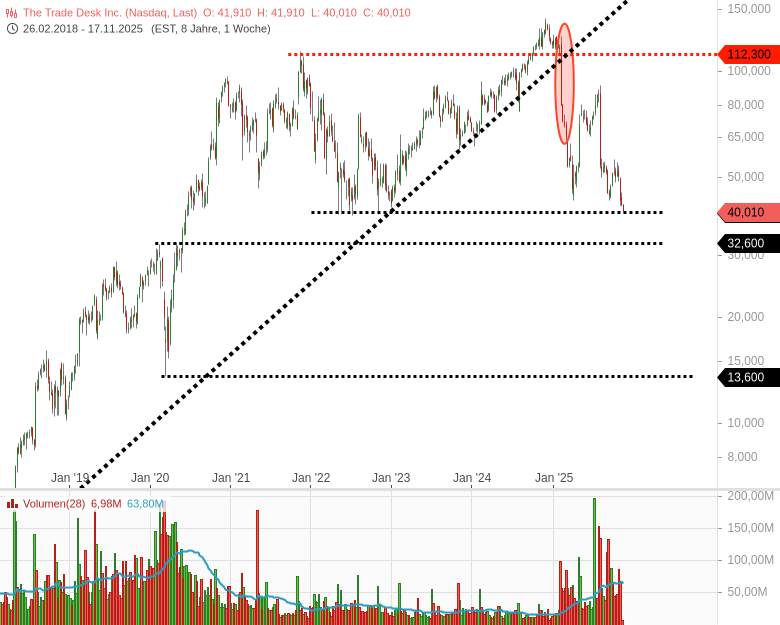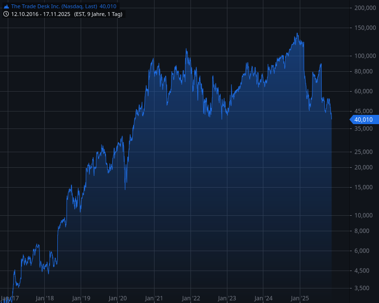 The Trade Desk ist der größte unabhängige Werbeeinkäufer der Welt.Die Aktie von The Trade Desk fällt nicht, weil das Geschäftsmodell schwach ist, sondern weil die Erwartungshaltung vorher astronomisch war. Der Markt hat jahrelang eine perfekte Story eingepreist, zweistellige Wachstumsraten, steigende Werbebudgets, exponentielles Connected TV und eine KI-Werbeplattform, die jeden Dollar besser ausgibt als alle anderen. Sobald so eine Aktie auch nur minimal enttäuscht, wird sie gnadenlos abverkauft, weil die Bewertung vorher wie auf Steroiden war. Genau das ist passiert. Das Management hat zuletzt vorsichtiger formuliert, die Kunden sind in diesem Umfeld sensibler bei Werbebudgets, Großkunden verschieben Kampagnen, und Retail Media wächst zwar stark, frisst aber kurzfristig Marge. Gleichzeitig steigt der Druck durch Amazon, Google und wachsende Retail Media Netzwerke, die ihre Daten lieber selbst monetarisieren.