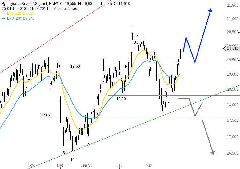 Die im Dezember gestartete Kaufwelle in ThyssenKrupp führte die Aktie bis auf ein neues Hoch bei 20,72 Euro, womit es den Bullen auch gelang, den starken Widerstandsbereich bei 19,60 Euro zu überwinden. Der Ausbruch hätte die Basis für einen dynamischen Rallyverlauf bilden können, aber hierfür hatten die Bullen dann keine Kraft mehr. Stattdessen fielen die Kurse bis in den März hinein deutlich zurück. Erst bei 17,65 Euro konnte sich dieser wieder stabilisieren und seit dem tendiert die Aktie wieder nach oben.