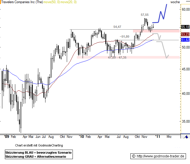 Rückblick: Mit 57,55 $ erreichte die Travelers Aktie in der Woche zum 05. November ein neues Mehrjahreshoch und konnte damit auch den Widerstandsbereich bei 54,47 $ nachhaltig überwinden. Dieser drückte seit Ende 2009 auf die Kurse und leitete anschließend immer wieder größere Konsolidierungen ein. Dabei etablierte sich der Bereich um 47,50 $ als untere Unterstützung, womit sich die Aktie über Monate seitwärts bewegte.