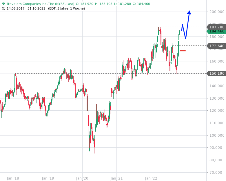 Es gibt Aktien bei denen man sich ärgert, diese zu spät entdeckt zu haben. Die Anteilsscheine des US-Versicherers Travelers gehören definitiv dazu. Das Unternehmen ist im Dow gelistet und dürfte in den vergangenen Wochen eine Stütze für den Index gewesen sein, denn die Kurse konnten ausgehend von ca. 150 USD auf knapp 185 USD zulegen. Damit rückt nun auch das Allzeithoch bei 187,98 USD in greifbare Nähe.