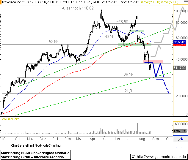 Die Travelzoo Aktie kletterte im Juli nochmals weit in Richtung Allzeithoch bei 110,62 $ hinauf, bevor es am 21.07. zu einem starken Kurseinbruch kam. Seit dem geht es für die Aktie steil bergab, sogar der Unterstützungsbereich bei 36,90 - 37,82 $ wurde signifikant unterschritten.