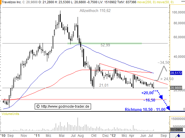 Die Travelzoo Aktie setzt erneut auf die Unterstützung bei 21,01 $ auf, wo auch die Tiefs seit Ende 2011 lagen. Durch die immer tieferen Erholungshochs in den letzten Monaten ergeben sich die Konturen eines fallenden bärischen Dreiecks.