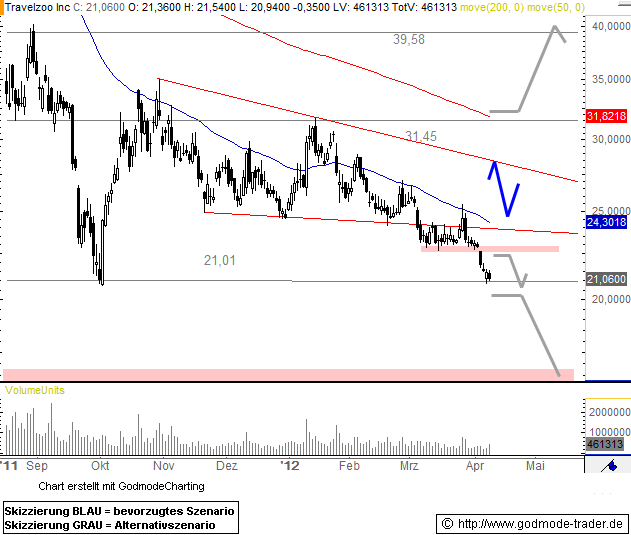 Nach Gerüchten um Übernahmepläne springt die Travelzoo Aktie heute vorbörslich deutlich nach oben, aktuell notiert der Wert über 31 % im Plus bei 27,60 $. Dieser Kurssprung erfolgt in einem mittelfristigen Bärenmarkt, nachdem gestern fast die 2011er Tiefs an der 21,01 $-Marke erreicht wurden.
