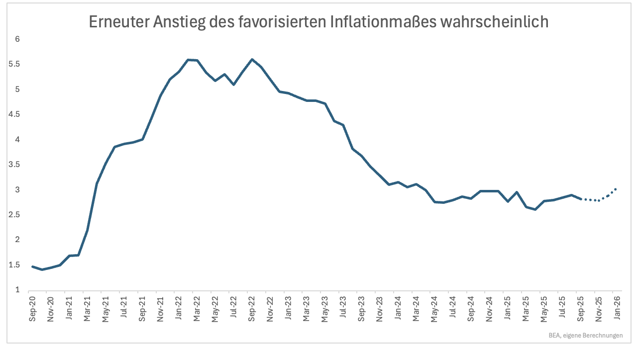Noch problematischer wird die Datenlage, wenn es um das favorisierte Inflationsmaß der Fed geht. Dieses liegt noch bei knapp 3 %. Nach einem leichten Rückgang zum Jahreswechsel ist mit einem erneuten Anstieg auf 3 % zu rechnen.