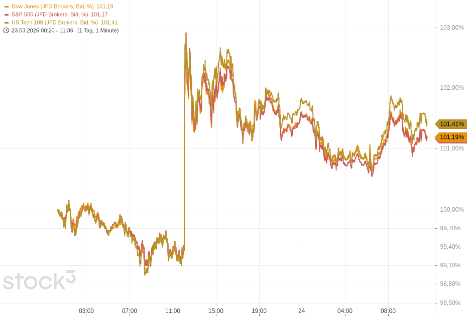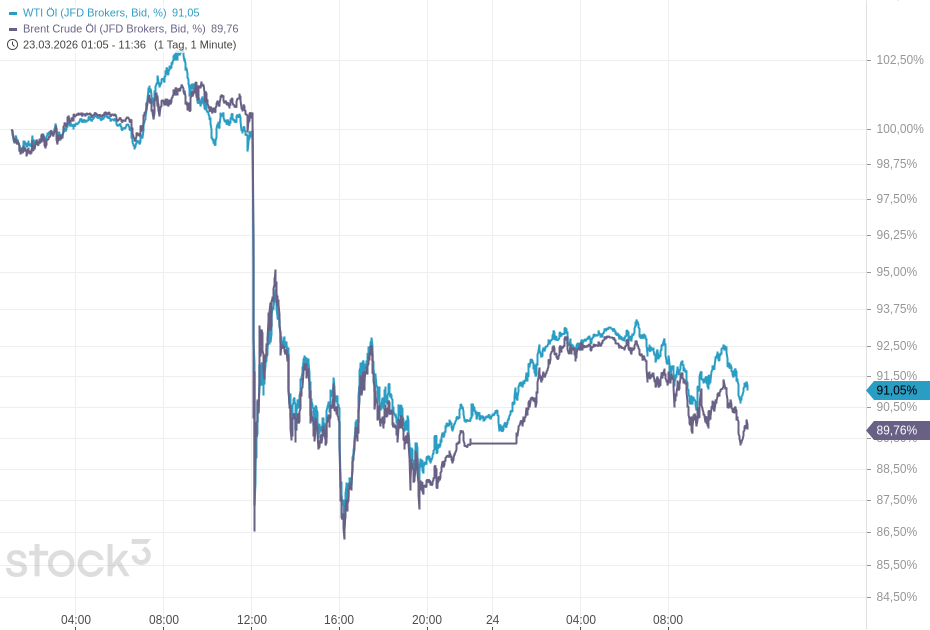Am Montag um 12:04 Uhr MEZ schrieb US-Präsident Donald Trump auf Truth Social von "produktiven Gesprächen" mit dem Iran und kündigte an, dass Angriffe auf die Energieinfrastruktur des Landes für fünf Tage ausgesetzt würden. Daraufhin brachen die Ölpreise dramatisch ein, während die US-Aktienfutures in die Höhe schossen. Anleger reduzierten damit ihre Erwartungen an eine längere Dauer des Konflikts.