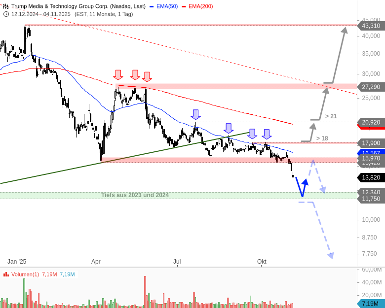 Fazit: Abgekoppelt vom starken Gesamtmarkt befindet sich die Trump-Media-Aktie in diesem Jahr in einem soliden Bärenmarkt und erzeugt wenig überraschend ein neues Verkaufssignal. Solange kein Kraftakt der Käufer erfolgt, könnte das Trauerspiel weitergehen. Mit dem bärischen Setup und ohne eine Rückkehr über den EMA50 bleibt das Papier höchstens auf der Short-Seite interessant.