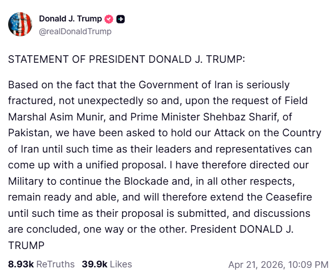 "Aufgrund der Tatsache, dass die Regierung des Iran ernsthaft zersplittert ist – was nicht unerwartet kommt –, und auf Ersuchen von Feldmarschall Asim Munir sowie des pakistanischen Premierministers Shehbaz Sharif wurden wir gebeten, unseren Angriff auf den Iran so lange auszusetzen, bis dessen Führung und Vertreter einen einheitlichen Vorschlag vorlegen können. Ich habe daher unser Militär angewiesen, die Blockade fortzusetzen und in jeder anderen Hinsicht einsatzbereit und handlungsfähig zu bleiben, und werde den Waffenstillstand folglich so lange verlängern, bis ein entsprechender Vorschlag vorgelegt ist und die Gespräche in die eine oder andere Richtung abgeschlossen sind", schrieb Trump auf seiner Social-Media-Plattform Truth Social.