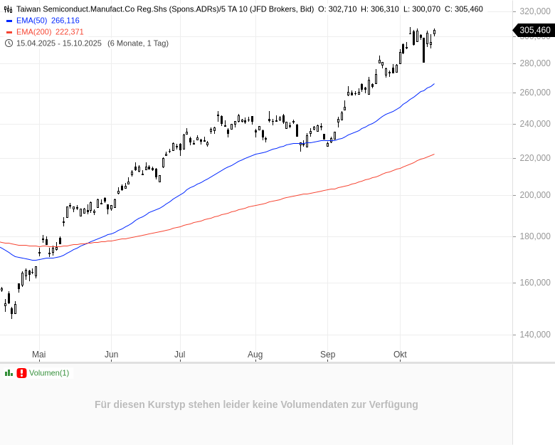 - Taiwan Semiconduct.Manufact.Co Reg.Shs (Spons.ADRs)/5 TA 10Kursstand: 304,710 $ (NYSE) - Zum Zeitpunkt der VeröffentlichungVerkaufenKaufen