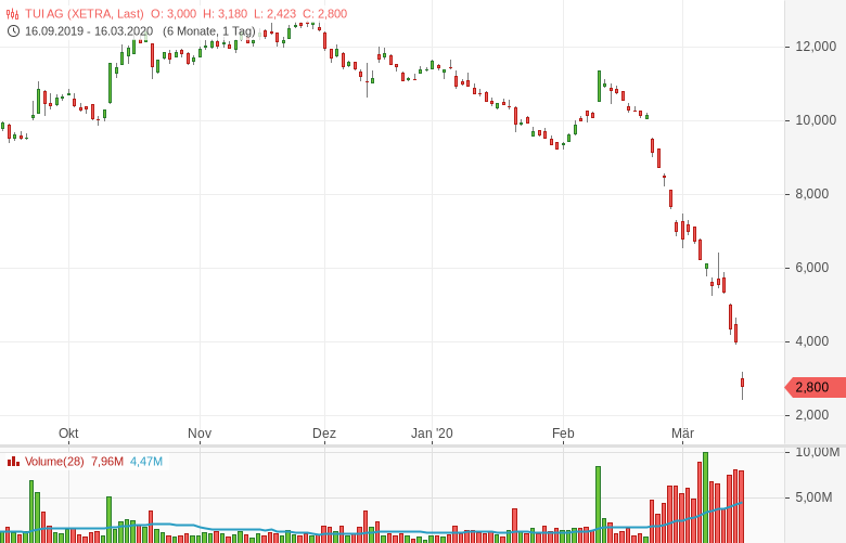 Nachdem die Bundesregierung am vergangenen Freitag angekündigt habe, den deutschen Unternehmen mit unbegrenzten Kreditprogrammen zu helfen, sei er aber zuversichtlich, dass das Unternehmen diese Krise überstehen werde. Allerdings sei davon auszugehen, dass der Tiefpunkt noch nicht erreicht sei. Die NordLB senkt ihre Anlageempfehlung für die TUI-Aktie auf „Verkaufen“ mit Kursziel 2,00 Euro.