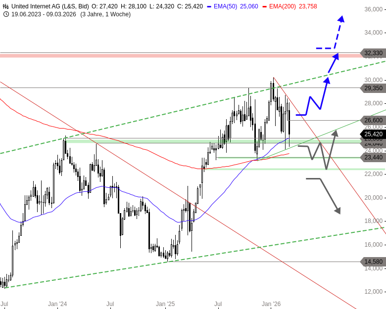 Charttechnisches Fazit: Noch gelingt es der Käuferseite, die Unterstützungen zwischen 24,64 und 25,06 EUR zu verteidigen. Ein Anstieg über 25,60 und 26,60 EUR könnte jetzt einen bullischen Konter auslösen und statt einer Korrektur in Richtung 22,80 EUR den Angriff auf die zentrale Widerstandsmarke bei 30,22 EUR initiieren. Darüber wäre der mittelfristige Aufwärtstrend der United-Internet-Aktie reaktiviert und sogar eine Rally bis 32,33 EUR möglich.
