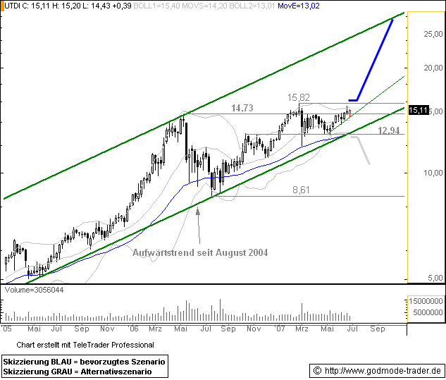 Rückblick: Die UNITED INTERNET Aktie befindet sich in einer mittelfristigen Aufwärtsbewegung. Im Februar 2007 markierte sie ein neues Allzeithoch bei 15,82 Euro und startete eine Zwischenkorrektur, welche oberhalb der 12,94 Euro Marke verlief. Seit Mai steigt die Aktie nun wieder an und nähert sich dem Allzeithoch bei 15,82 Euro. Das Chartbild ist auf sämtlichen Zeitebenen bullisch zu werten, die Korrektur der letzten Monate auf hohem Niveau kündigt eine weitere Aufwärtswelle an.