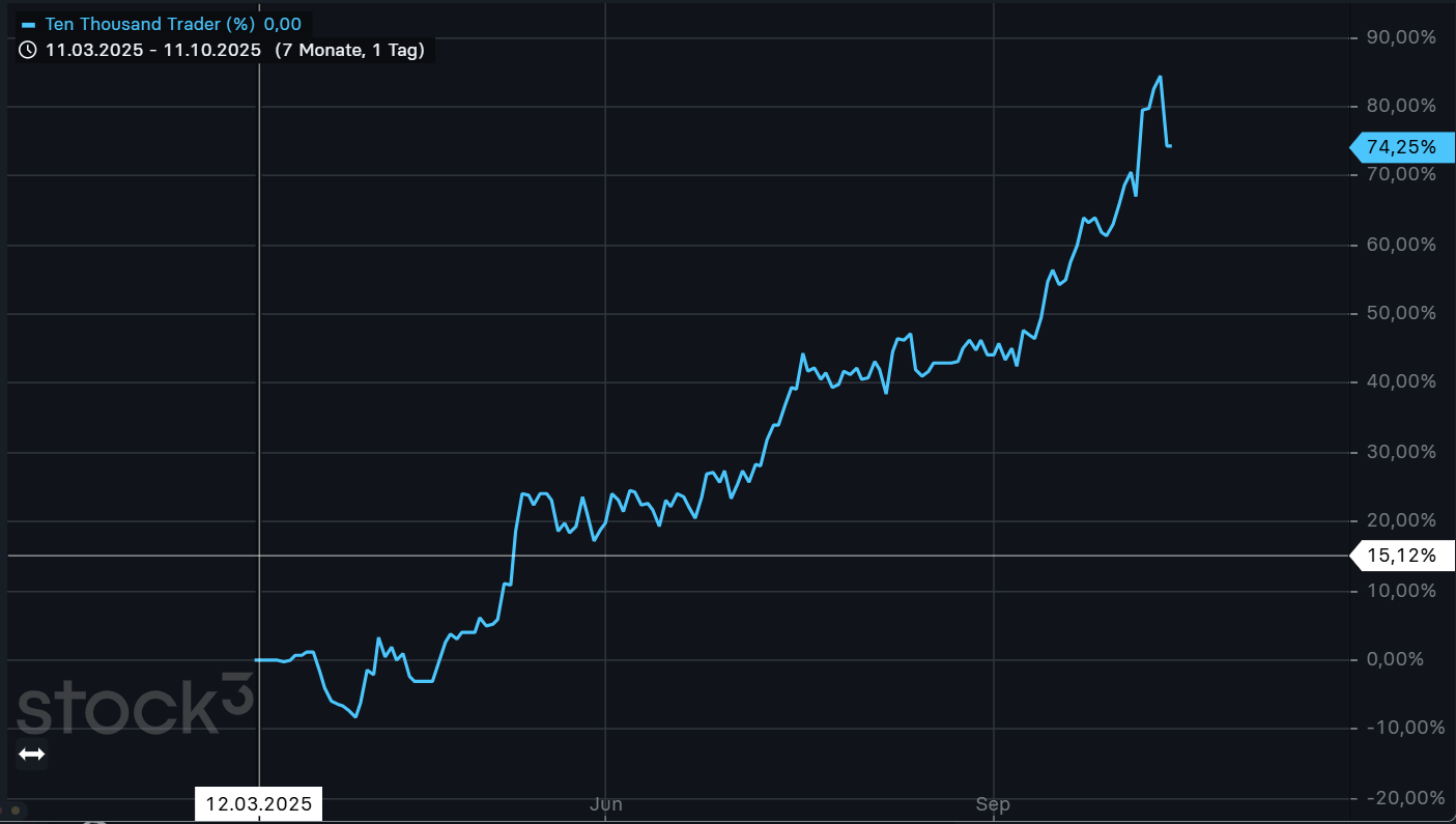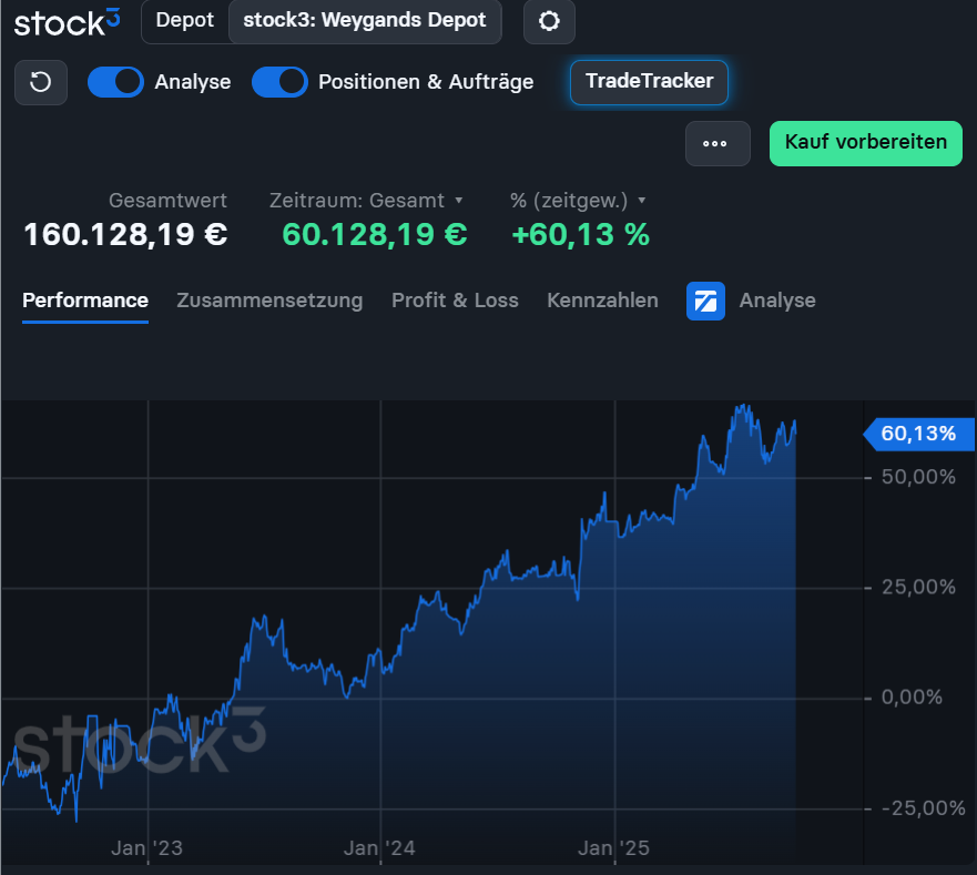 Dirk Siebenhaars Depot, das er seit März um 74% hochgehandelt hat, wird gerne von unseren Kunden nachgebildet. Der Vorteil für den User: Dirk handelt wie ich risikoadjustiert und marktunabhängig. Richtig große Korrekturen gibt es bei uns in der Performance nicht. Auch nicht, wenn der Markt komplett einbricht. Die durchschnittliche Haltedauer der Trades bei Dirk bei diesem Depot beträgt 4-5 Handelstage. Man muss als User hier etwas aktiver agieren, aber die sehr gute Performance ist es meines Erachtens wert. Unsere Kunden lieben dieses Depot.