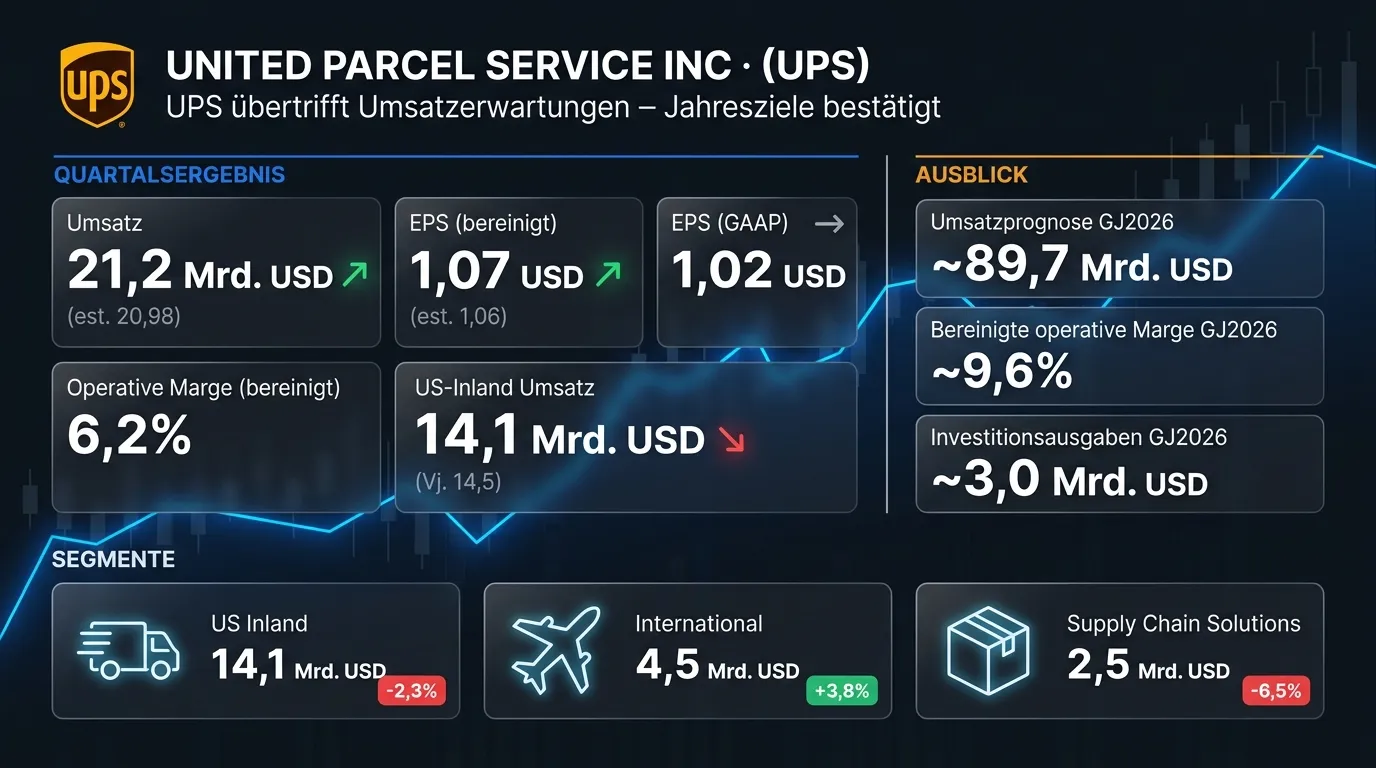 Der US-Paketdienstleister UPS hat im ersten Quartal 2026 einen Umsatz von 21,2 Mrd. USD erzielt und damit die Analystenerwartungen von 20,98 Mrd. USD übertroffen. Das bereinigte Ergebnis je Aktie lag bei 1,07 USD und übertraf die Konsensschätzung von 1,06 USD leicht, während das GAAP-EPS mit 1,02 USD darunter blieb. Der Umsatz im wichtigen US-Inlandssegment sank um 2,3 % auf 14,1 Mrd. USD, was auf einen erwarteten Volumenrückgang im Zuge strategischer Neuausrichtung zurückzuführen ist. CEO Carol Tomé erwartet ab dem zweiten Quartal eine Rückkehr zu Umsatz- und Betriebsgewinnwachstum sowie eine Ausweitung der bereinigten operativen Marge. UPS bestätigte die Jahresziele 2026 mit einem Umsatz von rund 89,7 Mrd. USD und einer bereinigten operativen Marge von etwa 9,6 %.