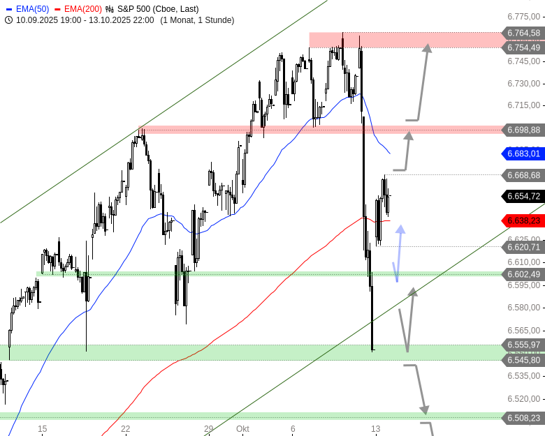 Ein schwächerer Handelsstart heute könnte zunächst die Käufer locken, eine Erholung zum Schließen des Eröffnungsgaps und darüber hinaus zum gestrigen Hoch und dem EMA50 im Stundenchart könnte folgen. Solide Kaufsignale würden erst bei der Rückeroberung von 6.700 Punkten entstehen, dann rücken die Allzeithochs wieder ins Visier. Auf der Unterseite sollte die Aufwärtstrendlinie bei rund 6.580 stützen, darunter wären wieder Abgaben bis 6.546 - 6.556 denkbar. Größere Verkaufssignale entstehen unterhalb dieses Supports.