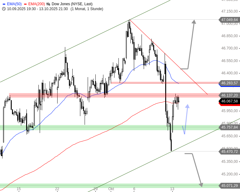Erholungsversuche könnten auch hier nach einem schwachen Start erfolgen. Wichtige Hürden sind bei 46.137 und 46.284 Punkten zu beziffern, erst oberhalb davon erhalten die Bullen leichten Aufwind. Solange der Index unterhalb davon notiert, ist Vorsicht geboten. Wirklich kritisch wird es aber erst beim Bruch der Aufwärtstrendlinie sowie des Freitagstiefs, dann könnte es zu einem weiteren Kursrutsch kommen. Erst bei 45.071 Punkten läge dann die nächste markante Auffangzone.