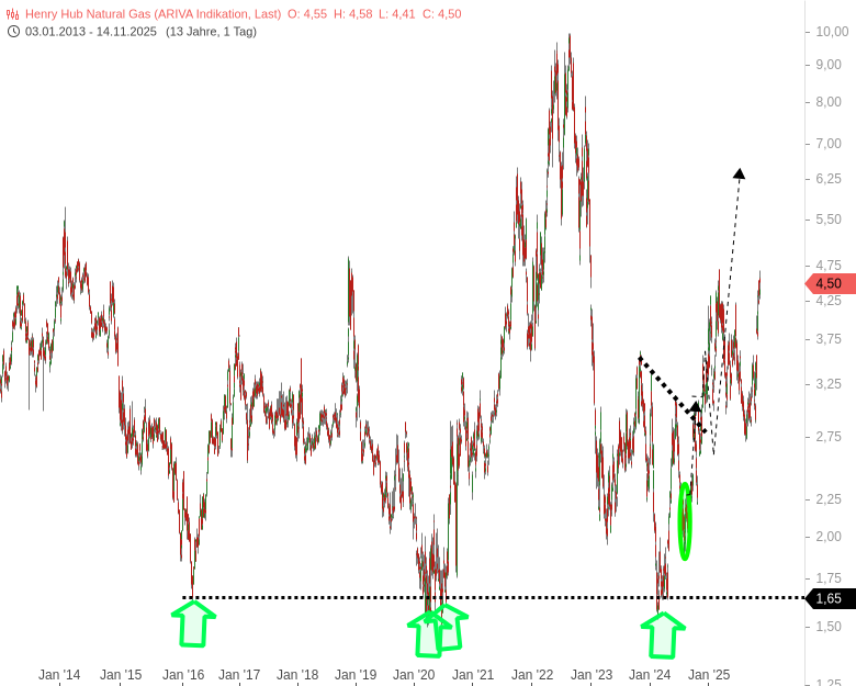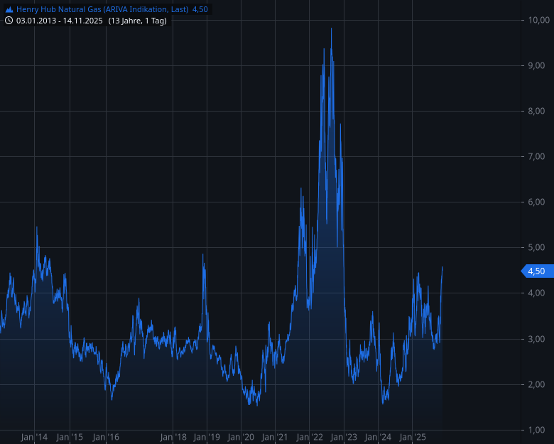 - Henry Hub Natural GasKursstand: 4,50 $/Btu (ARIVA Indikation) - Zum Zeitpunkt der Veröffentlichung