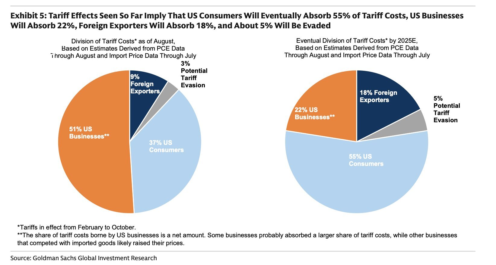 Aus dem Research der US-Investmentbank Goldman Sachs mit den jetzt neusten Daten: US-Zölle treffen vor allem US-Konsumenten und Firmen. Im August trugen US-Unternehmen mit 51%die Hauptlast, gefolgt von US-Verbrauchern mit 37%, ausländischen Exporteuren mit 9% und 3% entzogen sich per Umgehung. Für das Gesamtjahr 2025 zeichnet folgendes Bild ab: US-Verbraucher schlucken dann satte 55% der Kosten, US-Firmen sinken auf 22%, Exporteure tragen 18%, Ausweichreaktionen steigen auf 5%.