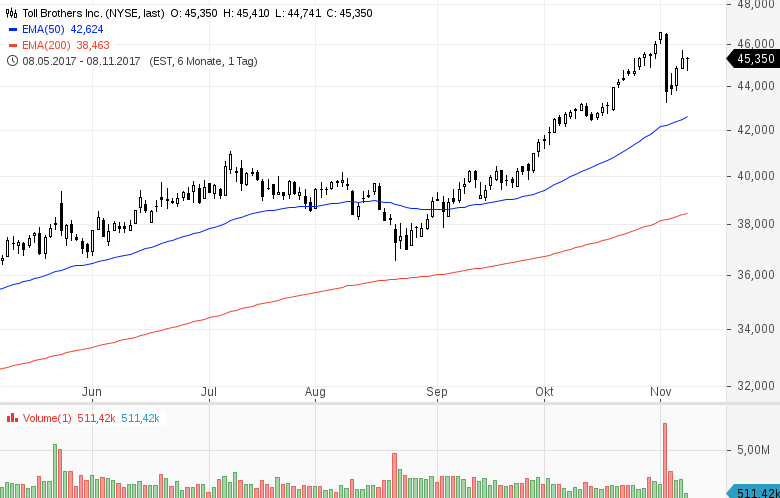 Anleger sehen das derzeit anders und verkaufen Unternehmen, die im hohen Segment bauen. Dazu gehört auch Toll Brothers. Der durchschnittliche Verkaufspreis der Häuser liegt bei 800.000, also im höheren Preissegment. Auf dem Papier trifft die Steuerreform zwar dieses Segment, aber eben nur theoretisch. Die tatsächliche Belastung ist minimal und an anderer Stelle sinkt die Steuerbelastung. Unterm Strich ist diese Veränderung irrelevant.