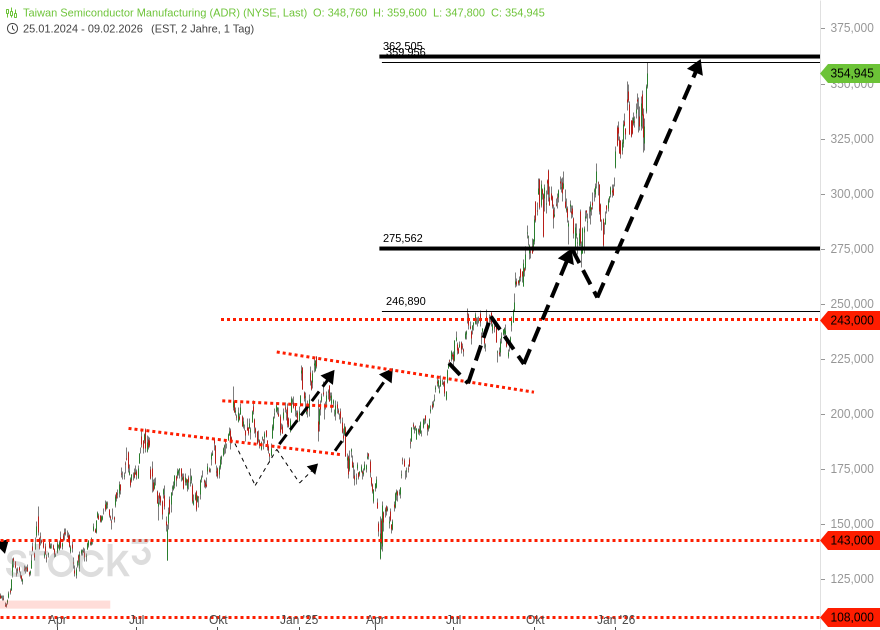 - Taiwan Semiconductor Manufacturing (ADR)Kursstand: 355,895 $ (NYSE) - Zum Zeitpunkt der VeröffentlichungVerkaufenKaufen