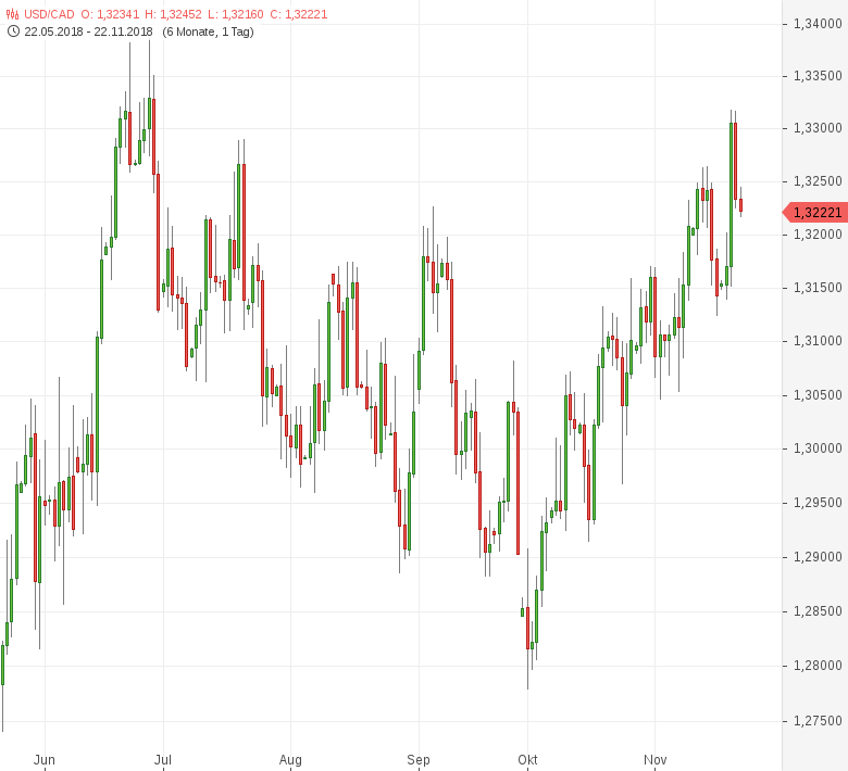 Gegen 11:40 Uhr MEZ notiert USD/CAD bei 1,3226. Die nächste wichtige Unterstützung liegt am Tief vom 16. November 2018 bei 1,3123. Auf den nächsten markanten Widerstand trifft das Währungspaar am knappen Fünfmonatshoch vom 20. November 2018 bei 1,3318.