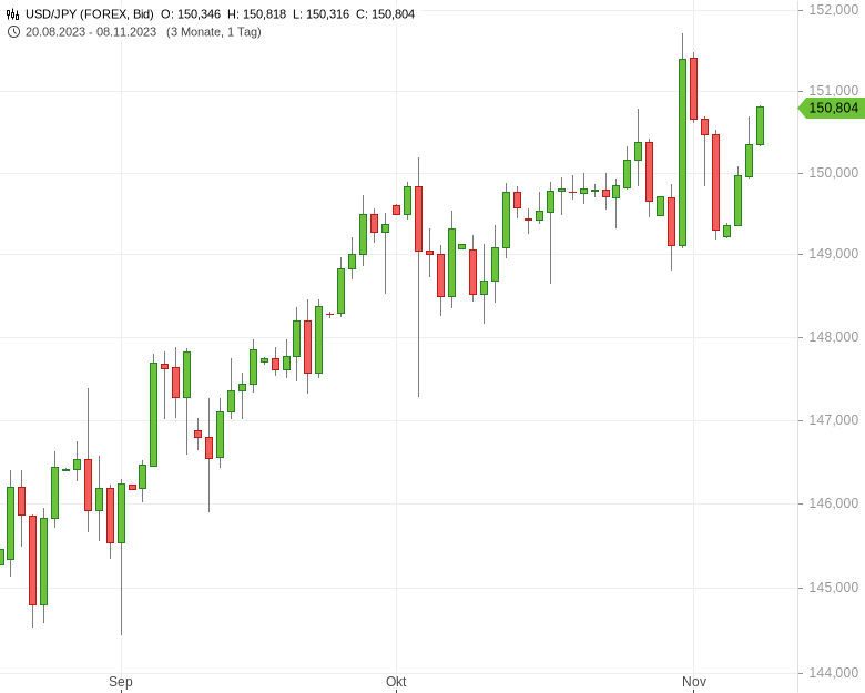 Gegen 13:15 Uhr MEZ notiert USD/JPY bei 150,79. Oberhalb des Zwölfmonatshochs vom 31. Oktober 2023 bei 151,72 findet sich der nächste markante Widerstand am 32-Jahres-Hoch vom 21. Oktober 2022 bei 151,94. Unterhalb der Tiefs vom 30. Oktober 2023 bei 148,80 und 10. Oktober 2023 bei 148,16 liegt die nächste markante Unterstützung am Tief vom 3. Oktober 2023 bei 147,27.