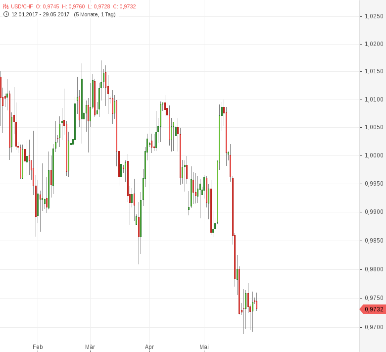 Neuenburg (GodmodeTrader.de) – USD/CHF ist im Verbund mit der Performance des US-Dollars auf breiterer Basis seitwärts in die neue Handelswoche gestartet. Damit setzt sich der Konsolidierungskurs seit Erreichen eines Sechseinhalbmonatstiefs am 22. Mai 2017 bei 0,9688 fort.