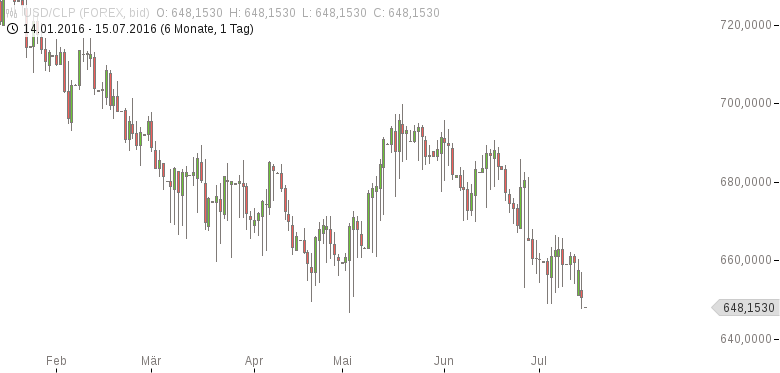 Gegen 10:35 Uhr MESZ notiert USD/CLP bei 648,1530. Die nächste markante Unterstützung liegt am Tief vom 3. Mai 2016 bei 646,6260. Der nächste wichtige Widerstand liegt am Hoch vom 6. Juli 2016 bei 666,45.