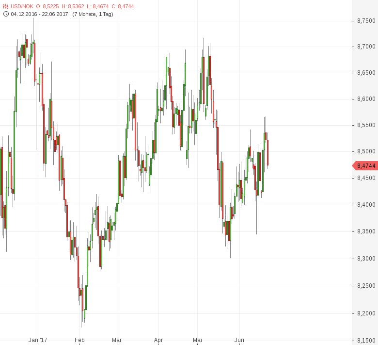 Gegen 12:25 Uhr MESZ wird USD/NOK bei 8,4752 gehandelt. Die nächste wichtige Unterstützung lässt sich am Tief vom 25. Mai 2017 bei 8,3007 lokalisieren. Das Währungspaar sieht sich am 2017er-Hoch vom 5. Mai bei 8,7171 dem nächsten markanten Widerstand gegenüber.