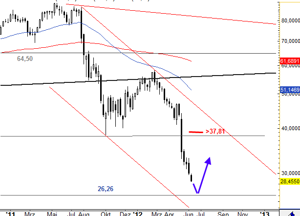 Die Abwärtsbewegung in der Aktie von Vallourec ist voll intakt. Allerdings nähert sich der Wert nun schon deutlich einer wichtigen Unterstützung bei 26,26 Euro an. Daher sollte man langsam an Gewinnmitnahmen aus Shortpositionen denken, denn im Bereich um 26,26 Euro kann es nach den starken Verlusten der Vorwochen durchaus zu einer Gegenbewegung von einigem Umfang kommen. Aber erst ein Ausbruch über 37,81 Euro würde die Abwärtsbewegung beenden.