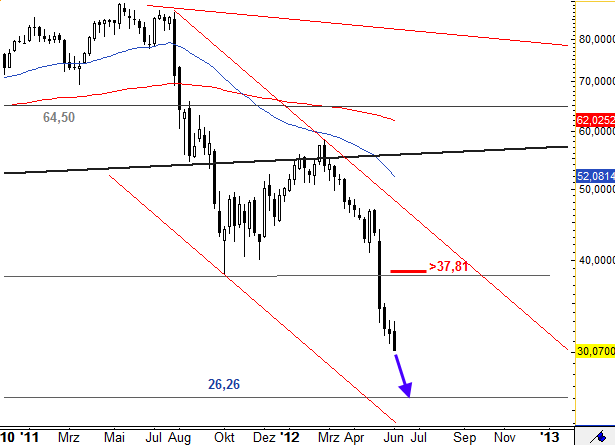 Die Aktie von Vallourec steht seit Wochen massiv unter Verkaufsdruck. Die wichtige Unterstützung bei 37,81 Euro hat der Wert schon lange deutlich durchbrochen. Aktuell fällt der Wert auf ein neues Tief in der Abwärtsbewegung der letzten Wochen ab. Diese Abwärtsbewegung ist aber noch nicht vorbei. Kurzfristig dürfte der Wert noch auf 26,26 Euro abfallen. Erst ein Anstieg über 37,31 Euro würde das Chartbild wieder deutlich aufhellen.