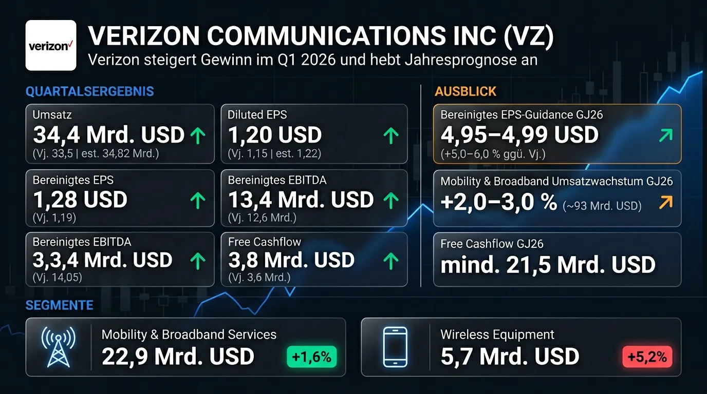 Verizon Communications (VZ) meldete für das erste Quartal 2026 einen Gesamtumsatz von 34,4 Mrd. USD (+2,9 % YoY), der die Konsensschätzung von 34,82 Mrd. USD knapp verfehlte, während das verwässerte GAAP-EPS von 1,20 USD und das Adjusted EPS von 1,28 USD die Konsenserwartung von 1,22 USD übertrafen. Das Quartal markiert das erste positive Q1-Postpaid-Phone-Nettowachstum seit 2013 und den höchsten Adjusted-EBITDA-Wert in der Unternehmensgeschichte mit 13,4 Mrd. USD. Die Frontier-Akquisition, die am 20. Januar 2026 abgeschlossen wurde, ist ab diesem Quartal vollständig in den Zahlen konsolidiert und prägt sowohl die Umsatz- als auch die Bilanzentwicklung maßgeblich.