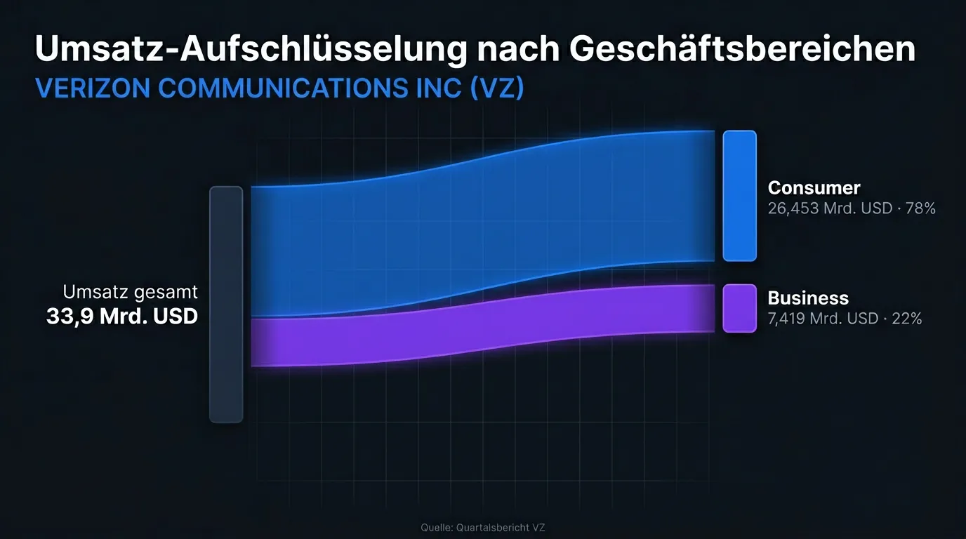 Die GuV-Struktur zeigt eine klare Operating-Leverage-Story: Während die Umsatzkosten moderat stiegen, gelang es Verizon, die SG&A-Aufwendungen um 3,1 % YoY zu senken – ein Zeichen konsequenter Kostendisziplin im Transformationsprozess. Die Operating Margin verbessert sich leicht, und die Abschreibungsbelastung steigt infolge der Frontier-Integration spürbar.