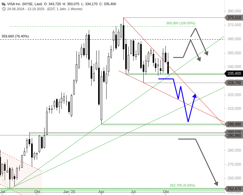 Charttechnisches Fazit: Unterhalb von 333,47 USD wären nicht nur die Aufwärtstrendlinie des letzten Jahres gebrochen, sondern auch ein zentraler Support, der die Fortsetzung der April-Rally in Richtung des Rekordhochs der Visa-Aktie noch ermöglicht hätte.