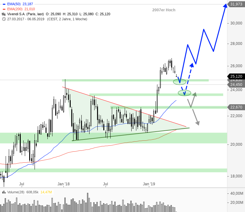 Der Preisbereich bei 24,45 - 24,87 EUR stellt die obere von zwei potenziellen Kaufbereichen dar, der untere liegt bei 23,50 - 23,70 EUR. Von einer dieser beiden Zonen aus sollte eine neue Aufwärtswelle starten, welche den Wert bis 28,00 und langfristig zum 2007er Hoch bei 31,97 und zum Tief aus 2001 bei 38,92 EUR tragen könnte.