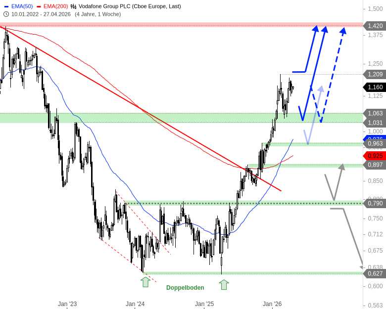 Klettert die Aktie früher oder später auch über 1,21 GBP, wäre Platz für eine Rallyfortsetzung in Richtung 1,42 - 1,44 GBP. Dort liegen auch Zwischenhochs aus den Jahren 2021 und 2022. Spätestens dort dürfte die Rally ins Stocken geraten.