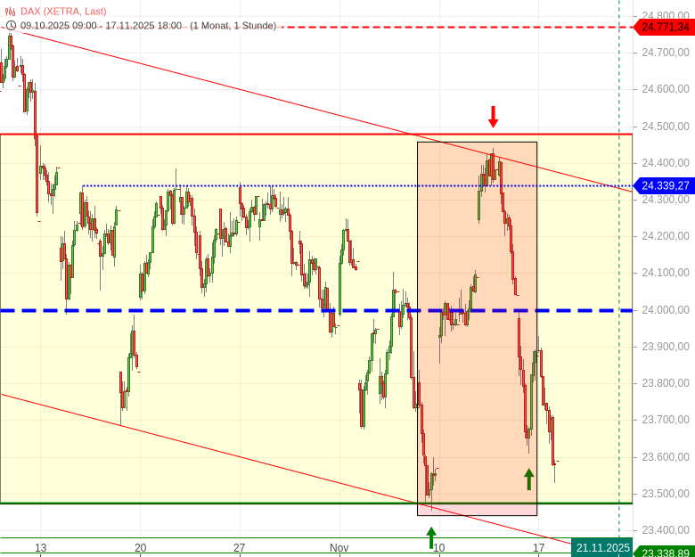 Angesichts der hohen Volatilität der vergangenen Tage erscheint ein Kursziel von 24.000 Punkten selbst nach dem gestrigen weiteren Kursrückgang nicht unwahrscheinlich – es reicht eine dynamische Wende, damit die Bullen diese Marke wieder ins Visier nehmen.
