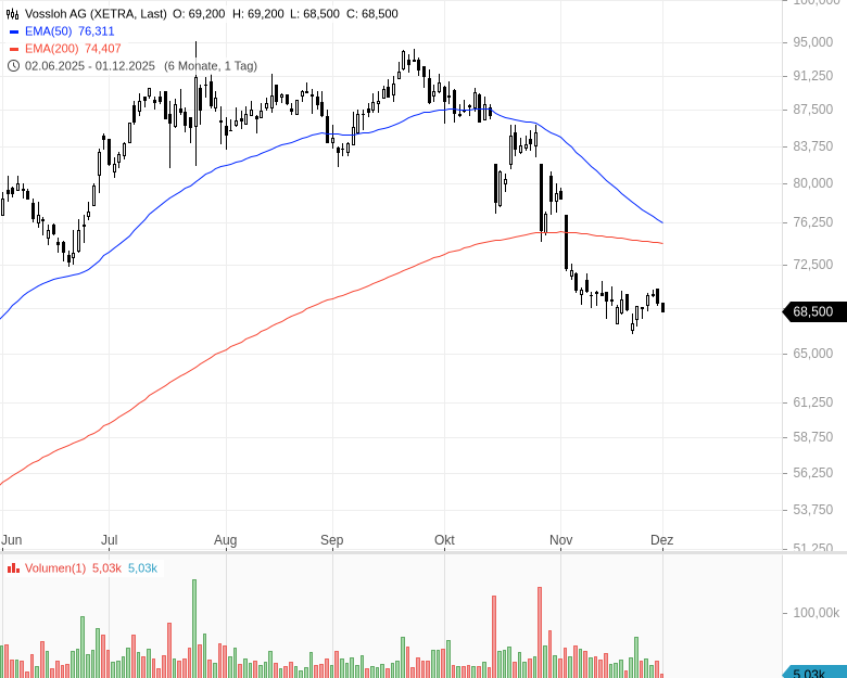 Fazit: Der jüngste Kursrücksetzer ist vor allem auf Verzögerungen bei der Auftragsvergabe zurückzuführen. Für geduldige Anleger eine interessante Einstiegschance. Die Vossloh-Aktie hat von über 90 EUR auf zuletzt 69 EUR korrigiert. Mehrere Analysten hatten die Aktie abgestuft, weil kurzfristig die Erwartungen überzogen waren. Sehr kurzfristige Kurstreiber sind kaum auszumachen. Erst im Laufe des Jahres 2026 dürfte die Aktie wieder mehr Schwung entfalten, wenn Aufträge in die Bücher kommen. Wer bis dahin Geduld hat, kann mit einer ersten Tranche einsteigen.